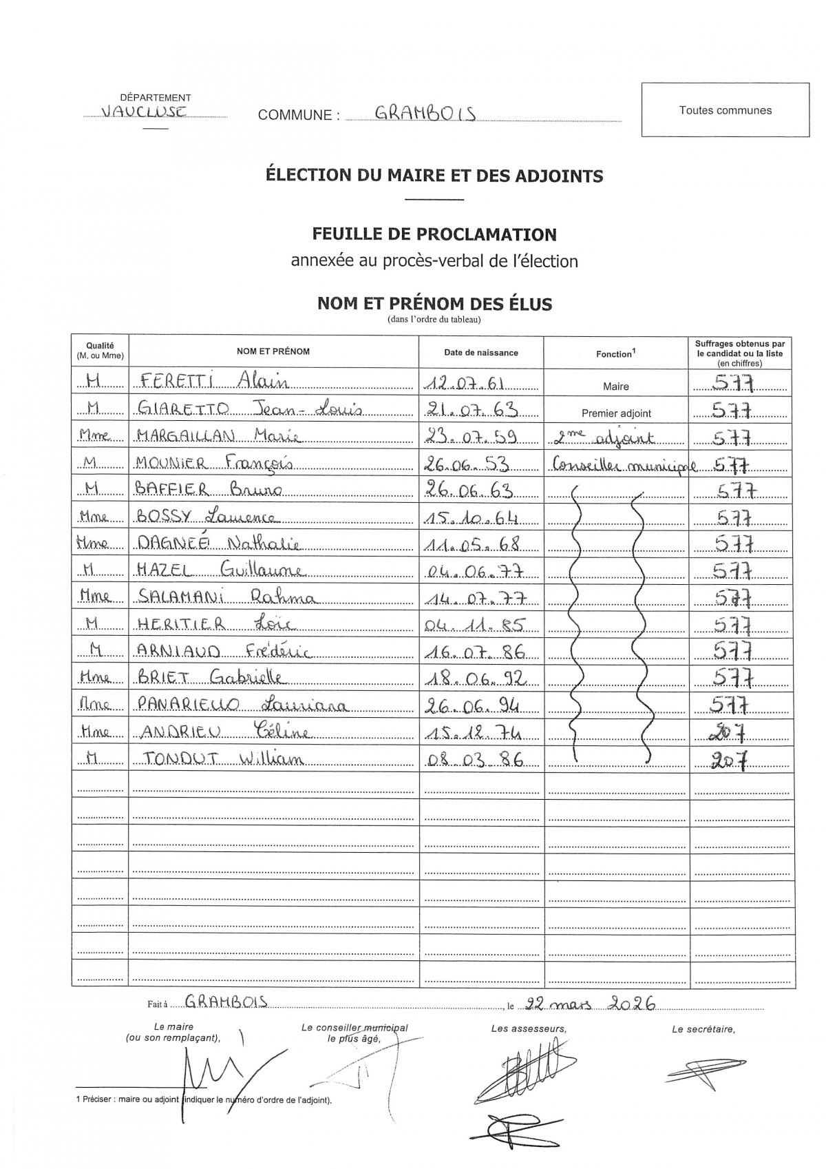 Election du Maire - Feuille de proclamation - Nom et Prénom des élus.